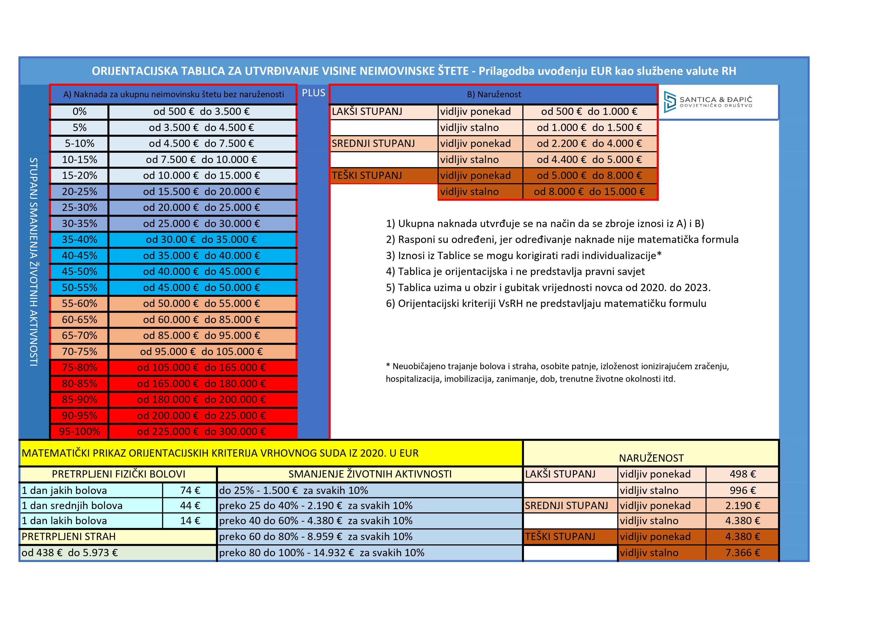 Dakle, ono što je bitno je to da postoje Orijentacijski kriteriji Vrhovnog suda RH za dosuđivanje neimovinske štete. Aktualni orijentacijski kriteriji doneseni su na sjednicama Građanskog odjela VSRH održanim 05.03.2020. i 15.06.2020., kad je donesena odluka o promjeni Orijentacijskih kriterija iz 2002., na način da se prihvaćeni iznosi naznačeni u novčanim jedinicama (kune) po svim osnovama podignu u odnosu na 2002. godinu za 50%, s time da se izmjena Orijentacijskih kriterija primjenjuje na sve parnične postupke za naknadu neimovinske štete u svim stupnjevima suđenja (ubuduće), tj. od dana prihvaćanja na sjednici Građanskog odjela VSRH (15. lipnja 2020.). Orijentacijski kriteriji mogu se pronaći na web stranici Vrhovnog suda RH i iste ćemo se potruditi analizirati u drugom članku, pogotovo u dijelu u kojem se uvijek govori da se isti ne primjenjuju na matematički način, odnosno kroz matematičku formulu.